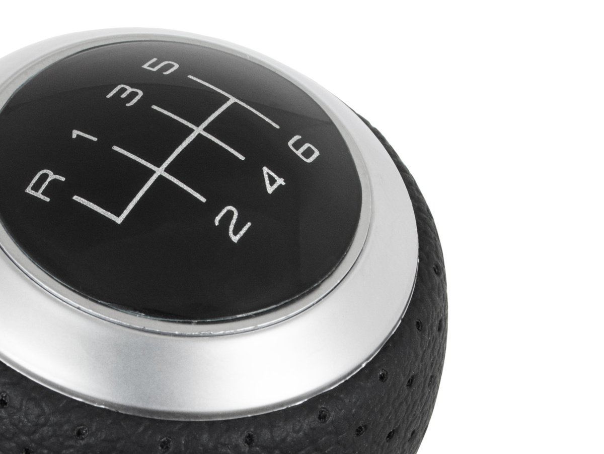Diagrama: juodas dangtelis su SIDABRINIU (matinio chromo) žiedu ir balta 6 pavarų + R diagrama