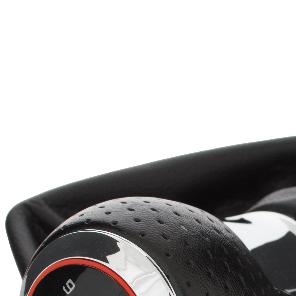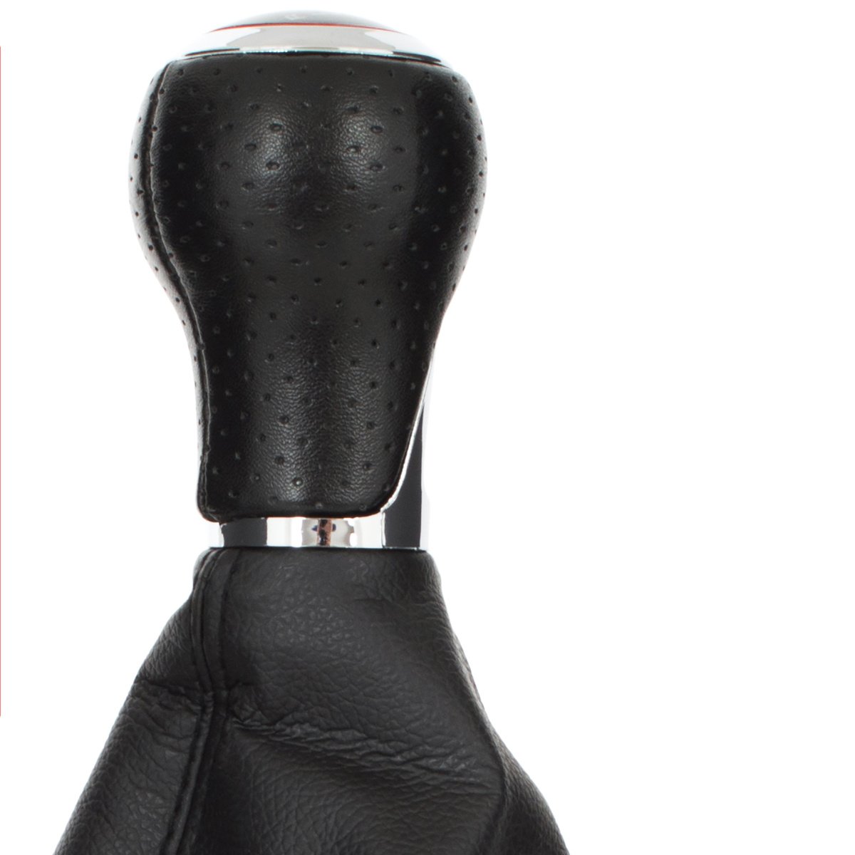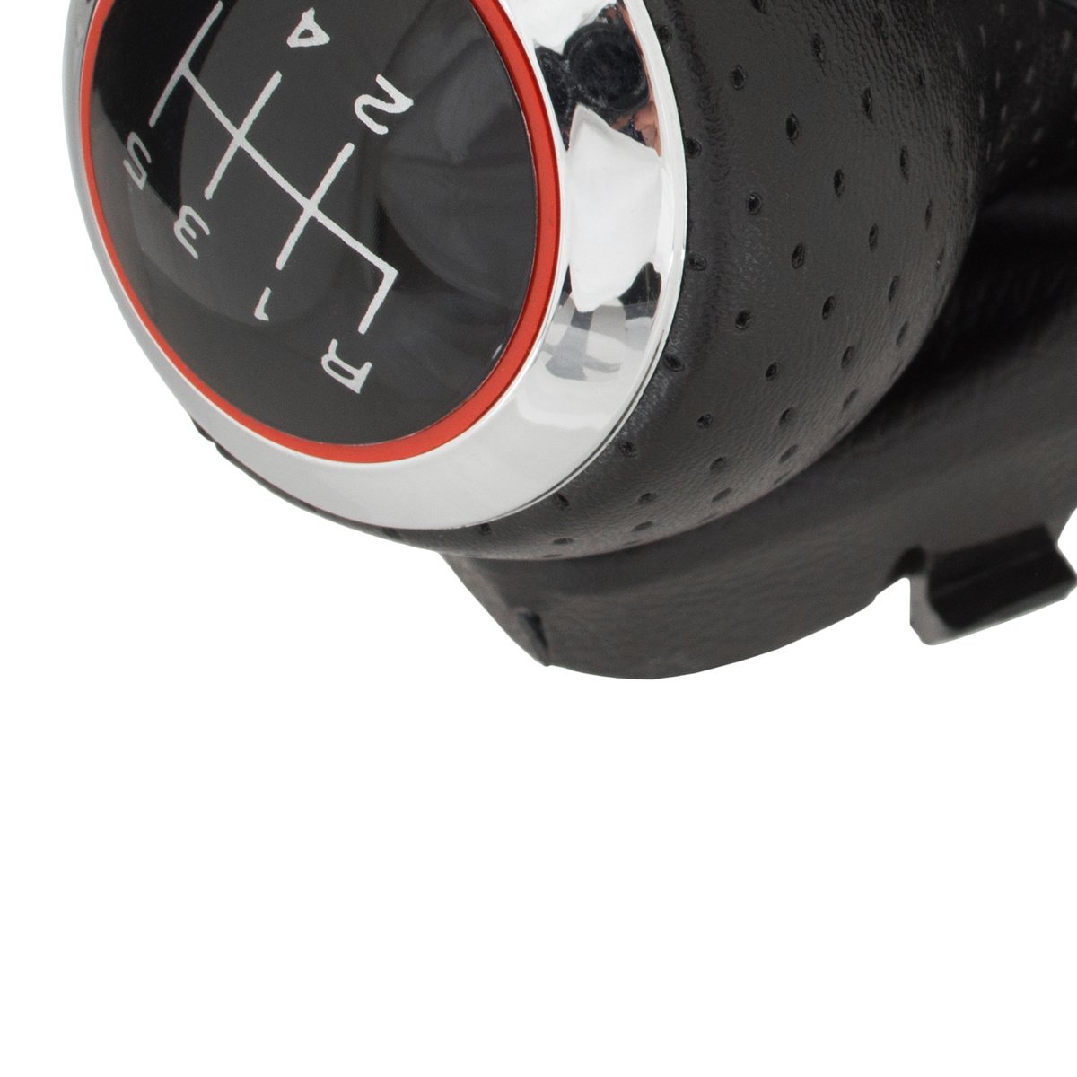 Diagrama: juodas dangtelis su raudonu apvadu, chromuotas žiedas ir balta 6 pavarų + R diagrama